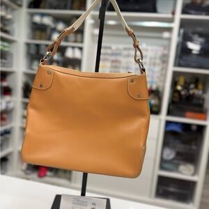 Stylish tan leather shoulder bag with dual front pockets. Perfect for everyday use. Includes COA.