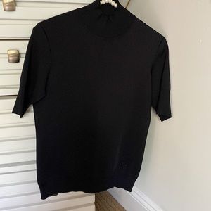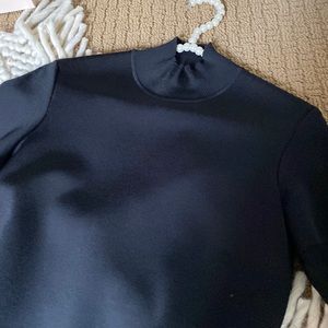 EUC in a beautiful Black Sheen with short sleeve Has stretch and it’s beautiful. Small crease on right arm from cleaners but not noticeable when wearing width is 16” and length is 17.75 approx. fits a 6