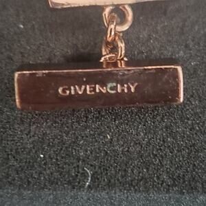 Givenchy necklace has two strands of link chains and the third has bronze tone beads with crystal accents. 25 inches long with a toggle closure. Very good condition.