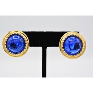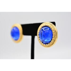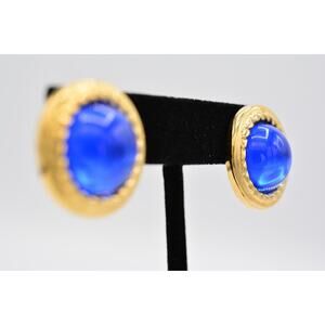 Givenchy Vintage Blue Cabochon Earrings Royal Round Gold Chunky Signed 80s Bin4