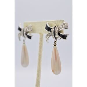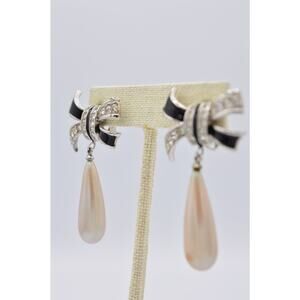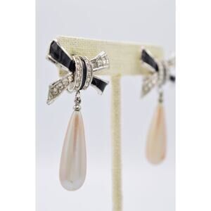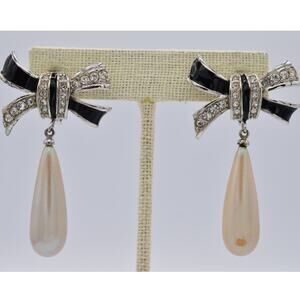 Givenchy Vintage Bow Clip On Earrings Black Pearl Rhinestone Enamel Signed BinAF