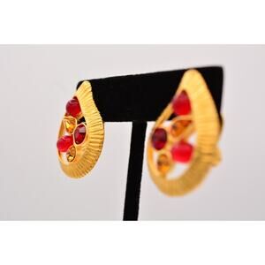 Givenchy Vintage Cabochon Clip On Earrings Red Crystal Brushed Gold Signed BinAG