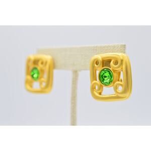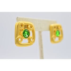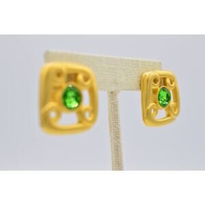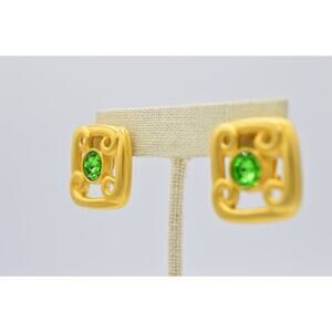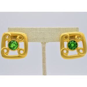 Givenchy Vintage Clip On Earrings Brushed Gold Green Crystal Signed 1980s Bin8