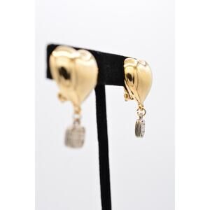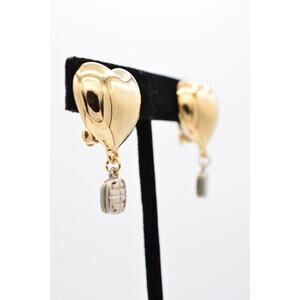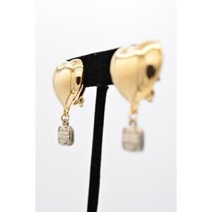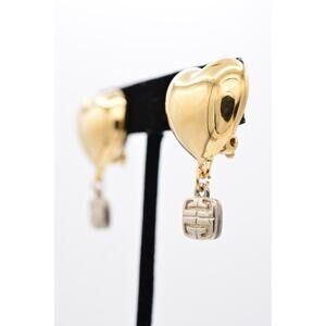 Givenchy Vintage Logo Heart Clip On Earrings Dangle Gold Silver Chunky Signed 9G