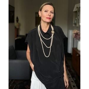 Givenchy Vintage Long Three Strand Faux Pearl Necklace Floral Rhinestone Clasp