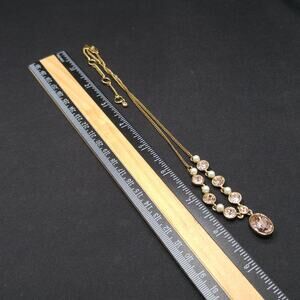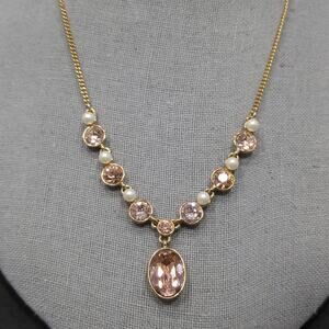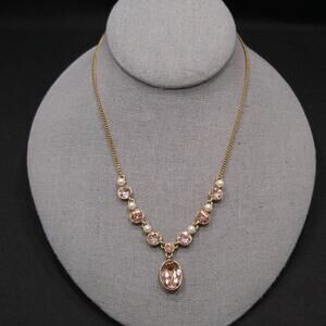 This elegant vintage Givenchy necklace from the 1990s features a timeless mix of blush pink rhinestones and faux pearls set in rich gold plating. The centerpiece is an oval faceted pink stone pendant framed in a gold-plated bezel, adding a touch of sophistication to any look.