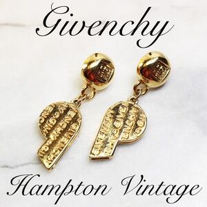 These gorgeous vintage earrings feature logos on gold plated, semi-spheres with gold plated surgical steel posts and Givenchy cartouche on the reverse. Monogramed whistle shapes dangle from these extraordinary pieces created by the House of Givenchy. These pierced earrings are gold plated, measure approximately 2”L x .5”W and are signed Givenchy on the backs of the earrings just below the posts. These pieces are in excellent vintage condition and include gold earrings backs.