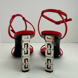 Lifted by a tower of G-Cube hardware, this smooth leather sandal is fastened at the ankle with a silvery logo buckle.