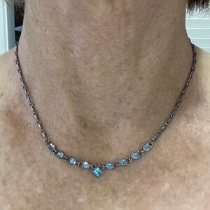 Designer Givenchy blue crystal necklace with gunmetal finish. Choker style, adjustable.