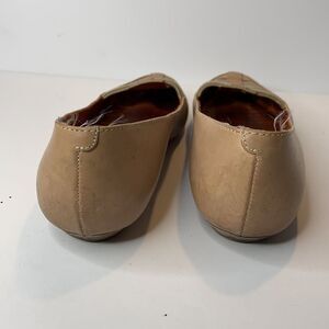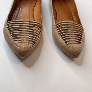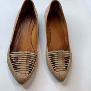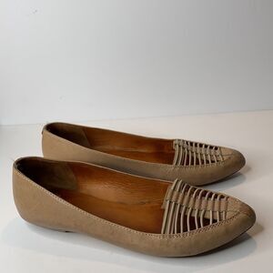 Givenchy tan leather ballet flats with pointed toe and elastic bands detail across top. Vintage flats with leather sole and lining. Minor leather wear and in great condition.
