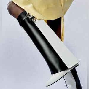 Disney collaborates with Givenchy to create a collection inspired by 101 Dalmations. These Shark Lock boots are designed with two-tone leather, a logo metal clasp around the leg with silver-finish 4G padlocks, an almond-toe silhouette and covered wedge heels.