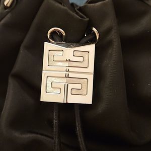 Givenchy 4g light bucket bag in black - black. size all. supple nylon with viscose canvas lining and polished silver-tone hardware. made in italy. top drawstring closure with metal 4g detail. one main compartment. calfskin leather trim. measures approx 7w x 8h x 3.75d. detachable leather top handle with a 5 drop. detachable leather shoulder strap with a 19 drop