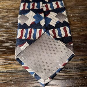 Stylish tie featuring a geometric pattern. Colors include red, blue, and beige. Perfect for adding a pop of color to any outfit.