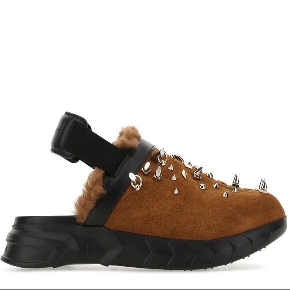 Set atop a comfortable rubber outsole, this pair of Marshmallow sandals from Givenchy call to mind soft and pillowy footsteps. Produced in Italy from black shearling, they feature spike stud detailing that adds a signature edgy finish to the pair.