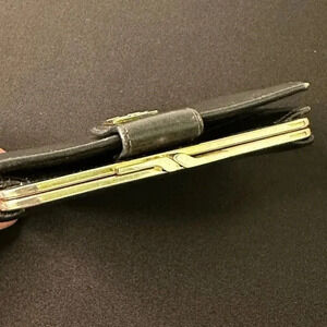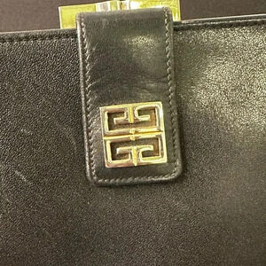 Givenchy black leather turn lock closure, vintage style, hardware has wear but still very pretty. Coin pocket, bill pockets and cc slots. Rubs, scratches and wear at edges & folds.