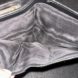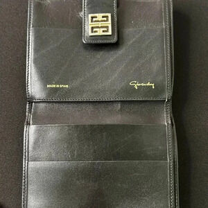 Givenchy black leather turn lock closure, vintage style, hardware has wear but still very pretty. Coin pocket, bill pockets and cc slots. Rubs, scratches and wear at edges & folds.