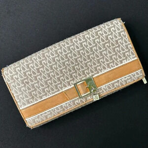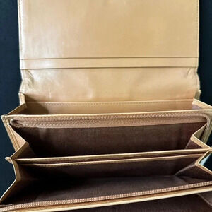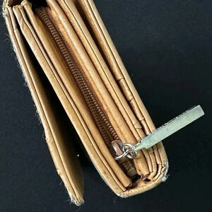 Pinky & Dianne long wallet is clean throughout, plenty of compartments and cc slots. Zipper runs smoothly and button is a bit loose. Scuffing at edges and folds.
