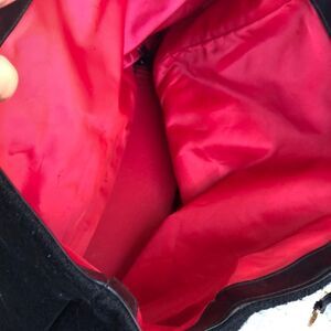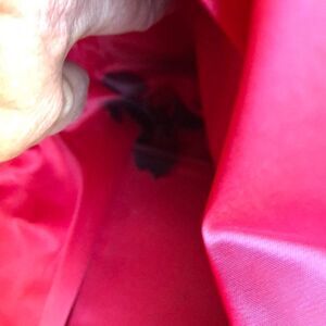 This is a large tote it is vinyl lining inside and as you say has an ink stain in the bottom corner. Does not show through the outside. Is made to look as if it’s wool but it’s not. Faux leather bottom. Measures approximately 14 12 x 5