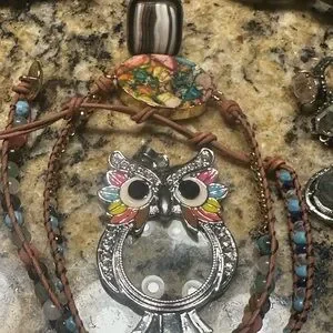 Pendants-labradorite, cherry blossom/flower agate, owl (glass and silver plated)
