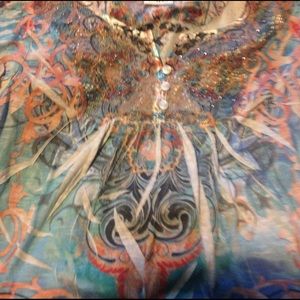The shirt is multicolored and has beads and an amazing embezzlement at the top of the shirt! The shirt is a medium! The light pink jeans are a size 2! You can wear them as skinny jeans or roll up the bottom and make them capri's only worn one time! The shirt has never been worn but the tags are off