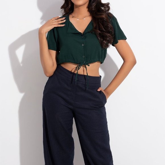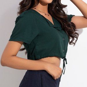 A basic casual crop top with short sleeves, self fabric waist tie up and V-neckline.