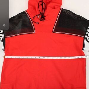Has a transparent mesh on the shoulders and on top of the center of the hoodie it is a quality mesh material . See pictures for measurements.
