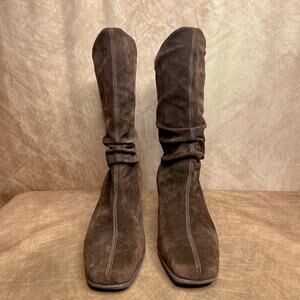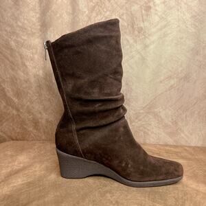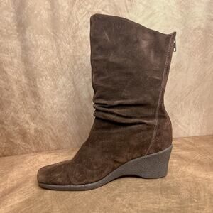 Y2K Glacee Brown Calf High Suede Leather Wedge Heel Zip Up Slouch Boots