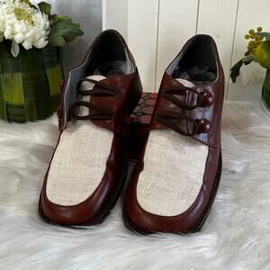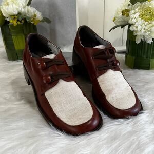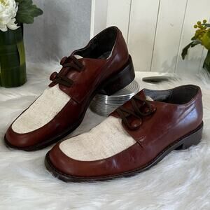 Gorgeous and Luxurious Italian Lamb Leather and Linen Toggle Button Closure Classic Preppy Academia Low Heel Loafers by Glacée. Partially Unfinished Felted Interior. Elastic Band and Button Closures. Slip-on. Brown Leather and Cream Natural Linen. 1.3” Heel. RARE. HTF. Women’s Size 6.