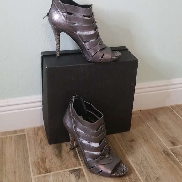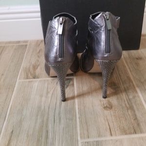 Metallic dark grey with snakeskin print heel. 4 inch heels, zip up back. Gently worn 2 or 3 times- like new!
