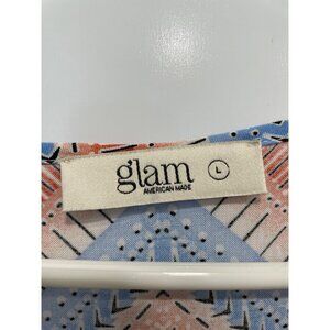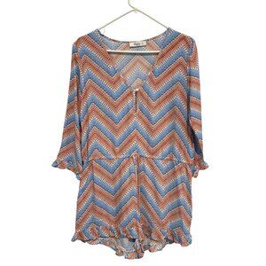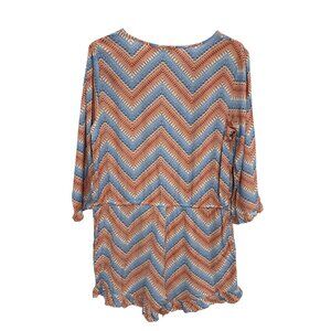 Glam 3/4 Sleeve Chevron Romper Size Large V Neck Drawstring Geometric Blue Peach