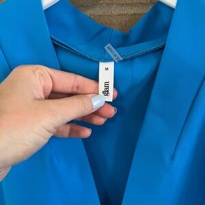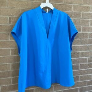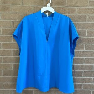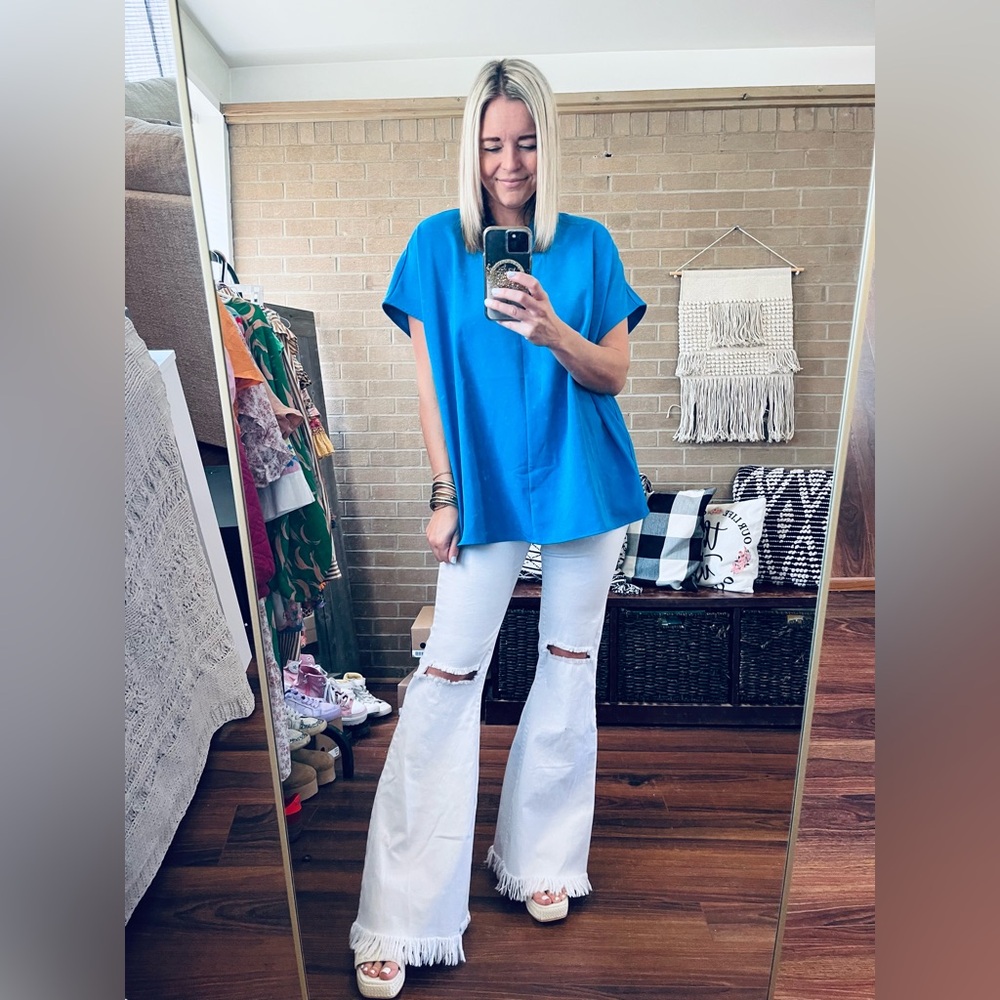 Stylish bright blue top paired with white flared jeans. Perfect for a casual day out. So chic