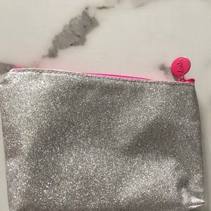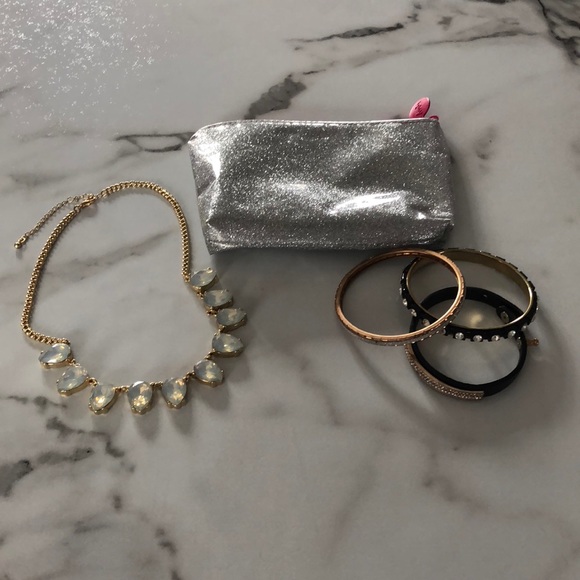 Ipsy glitter makeup pouch. 3 bangle bracelets. Gold and frosty opal-colored necklace