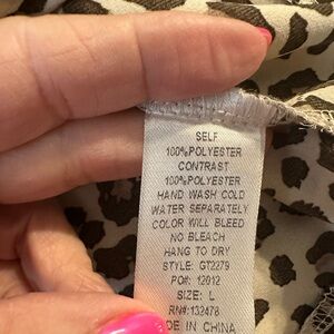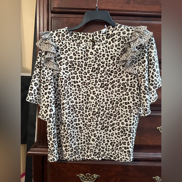 Stylish animal print blouse with ruffle sleeves. Perfect for a trendy look.