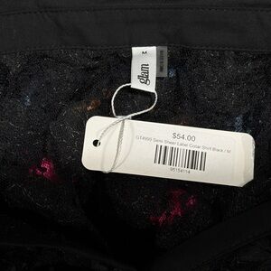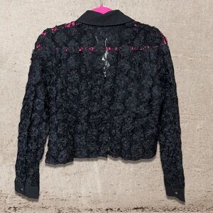 Elegant black blouse with floral lace design. Features a button-up front and collar. Perfect for a chic look.