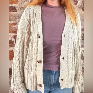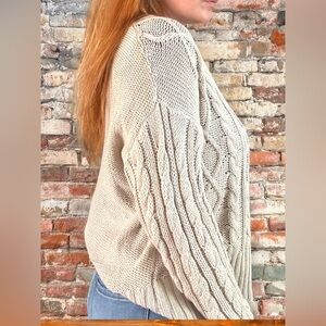 This Glam brand lightweight Cream Cable Knit Sweater is a stylish and versatile piece with a classic cable knit design. Its soft cream color pairs easily with various outfits, offering comfort and elegance. Perfect for any season, it's ideal for cozy moments or casual outings, blending warmth with chic sophistication.