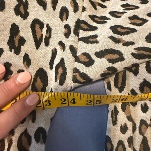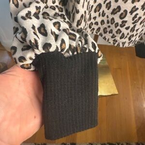 Stylish leopard print blouse. Features black cuffs and collar. Perfect for a glam look.