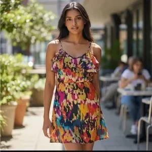 Bold and colorful mini dress with ruffle details. Ideal for lively outings.
