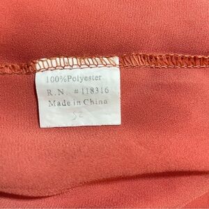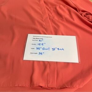 Chic and modern coral long sleeve blouse by Glam Dollz, size XL. Features a pointed collar with gold-tone stud accents, a draped open-back detail, and a stylish high-low hemline for a flattering silhouette. Lightweight 100% polyester fabric, perfect for layering or standalone wear.