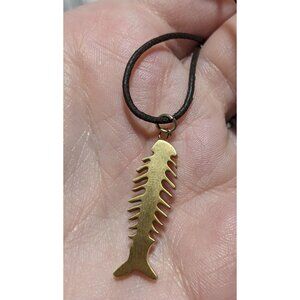 Gold fishbone pendant with rhinestones on a leather cord. Unique and stylish accessory for casual wear.