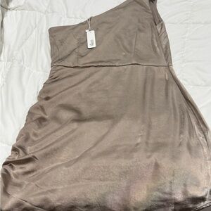 Elegant one shoulder dress by Glam. Features a shimmering taupe color. Perfect for evening wear.