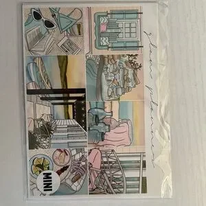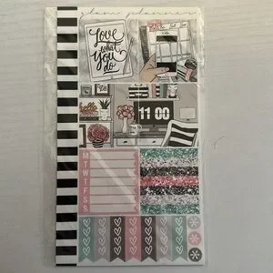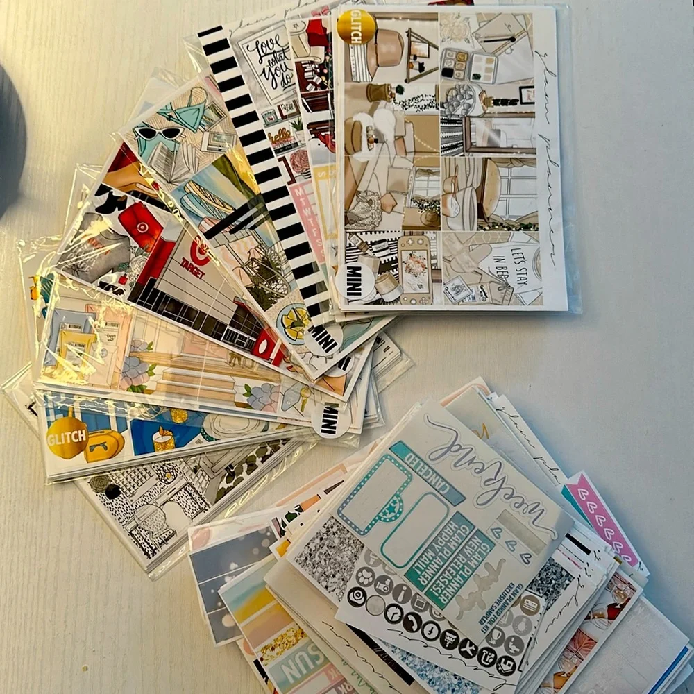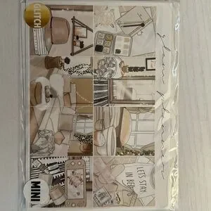 Glam Planner sticker sets featuring cozy home and holiday designs. Includes brown, red, green, and gold elements. Some are glitch, mini or surprise bag collections.