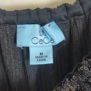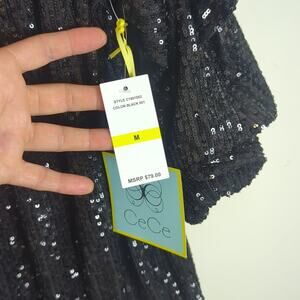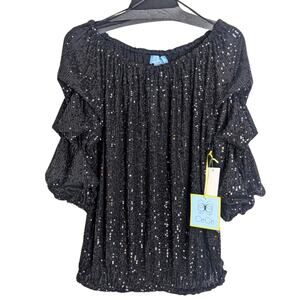New with tags. sequenced off the shoulder top with dramatic ruffled sleeves. elastic band on arms , waistline and neckline.