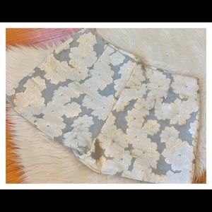 High waisted glam shorts with a golden touch. These shorts have a luxe look to them with the mix of cream, grey and gold accents. There's pockets too! And they've never been worn.