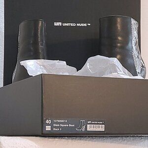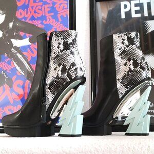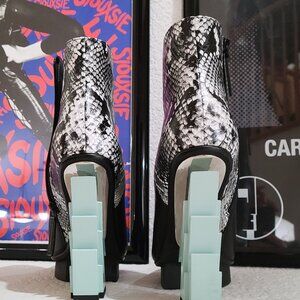 The Glam Square Boot is a maximalist platform bootie lifted by a lightning bolt heel. The style features a leather upper, a touch of retro glam rock, and a playful silhouette that will never go unnoticed.