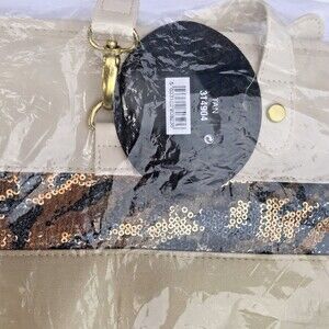 Glam Tote Bag. Tan & Gold, Double Shoulder Handles, Zips Shut, 2 Slide Pockets inside. Pretty Sequin Trim.