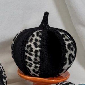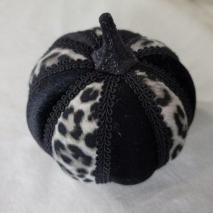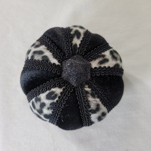 Black Velvet and Cheetah Print with , Black Gimp Trim and Black Glittered Stem. This small pumpkin measures 4.5" wide by 4.5" deep by 4.5" tall from bottom of Pumpkin to top of Glittered Stem! 🖤🩶🤍🖤🐈