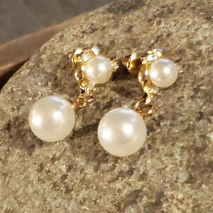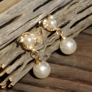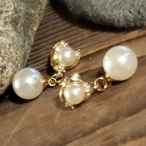 Glam White Faux Cultured Pearl Austrian Crystal Gold Plated Dangle Earrings