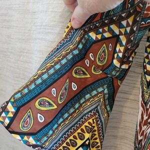 glam brand. size small. has a boho theme design. straight line dress. pull over the head. sleeves are 3/4 then has a bell shape at the end. rounded neckline. dress goes approximately to before the knee area depending on height so in the mini side of length. material is light weight. there is a button at the back of the neck and a key hole slit in the back to help you get the dress over your head. found with no issues or flaws. smoke free home. pet friendly home.