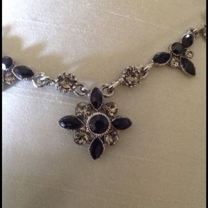 Black stones and rhinestones set in a beautiful pattern for a very dressy glamorous necklace. 15" extends to 18". Free matching earrings with purchase!