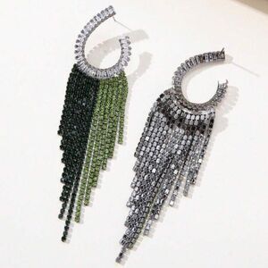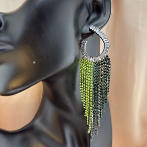 These glamorous earrings are a true show-stopper! Featuring shimmering crystal baguettes at the top and cascading green and black rhinestone fringe, they add instant sparkle and elegance to any outfit. Perfect for special occasions, nights out, or when you simply want to stand out.